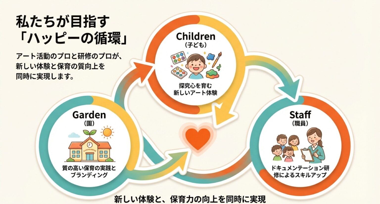 アート活動の様子を基に、観察眼を養うドキュメンテーション研修を実施。 保育の質を高め、職員のスキルアップを実現します。